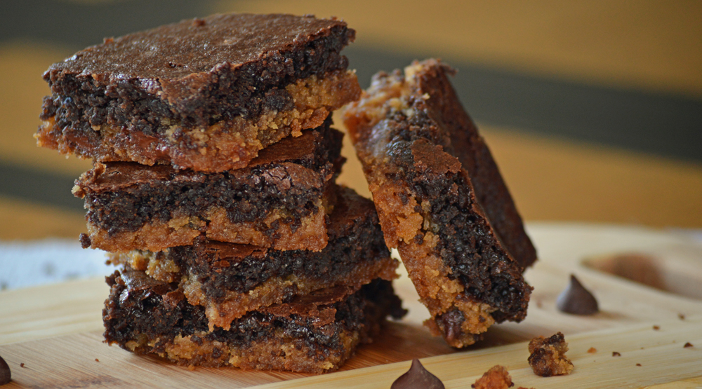 - Remove pans from fridge and pour brownie batter over top of cookie dough (dividing equally between pans).